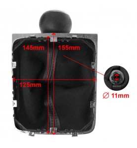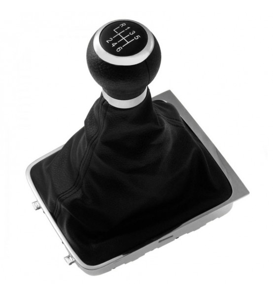 Μαύρο πόμολο ταχυτήτων κομπλέ με φυσούνα από τεχνόδερμα με λεπτομέρειες χρωμίου. Διαθέτει αριθμούς (1-6) και όπισθεν R.
