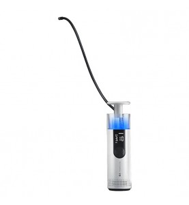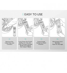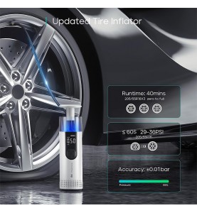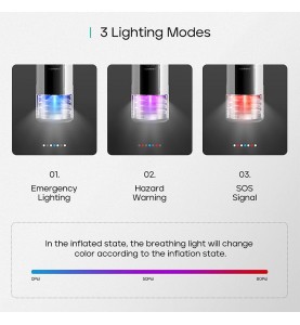 Διαθέτει φακό LED στο πάνω μέρος της σε περίπτωση που θέλετε να τη χρησιμοποιήσετε στο σκοτάδι. Καθώς φορτίζει μέσω USB, σας δείχνει το επίπεδο φόρτισης της μπαταρίας. Πιέστε το κουμπί εναλλαγής και επιλέξτε μεταξύ των ενοτήτων: PSI, BAR, KPA. Μπορείτε να αυξομειώσετε την πίεση του αέρα πιέζοντας τα κουμπιά.